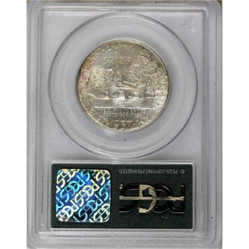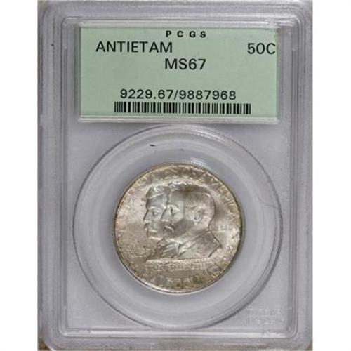 <B>1937 50C Antietam MS67 PCGS.</B></I> Dappled khaki-gold, rose, and aqua shades enrich the peripheries of this lustrous Superb Gem. Exceptional aside from a nearly imperceptible hairline to the left of Grant's ear. Housed in a green label holder.<BR><BR><b>Shipping:</b> Coins & Currency (<a target="_blank" href="http://www.heritageauctions.com/common/shipping.php">view shipping information</a>)