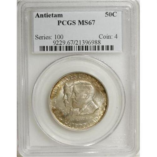 <B>1937 50C Antietam MS67 PCGS.</B></I> Superior luster and crisp detail enhance the visual appeal of this exquisitely preserved Superb Gem. A great example of this Civil War commemorative issue, faintly toned overall with richer red at parts of the obverse periphery. PCGS has graded just 13 finer pieces (10/07).<BR><BR><b>Shipping:</b> Coins & Currency (<a target="_blank" href="http://www.heritageauctions.com/common/shipping.php">view shipping information</a>)