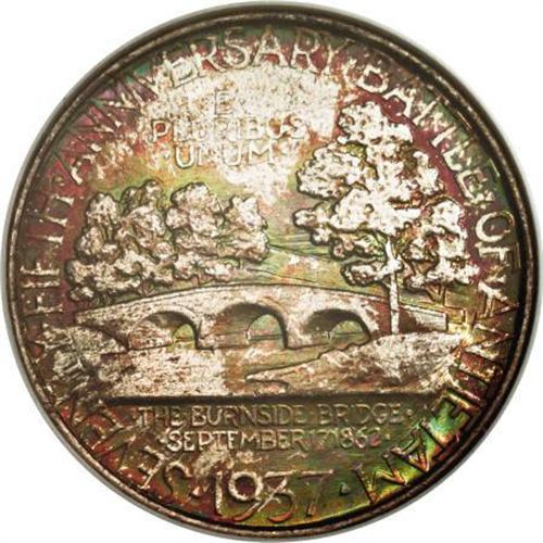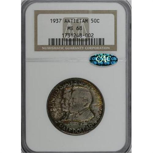 <B>1937 50C Antietam MS68 NGC. CAC.</B></I> The Battle of Antietam (or Sharpsburg, as it was commonly called in the South), fought on Sept. 17, 1862, was the "bloodiest day of the Civil War," with almost 23,000 dead and wounded. The 1937 Antietam half dollar commemorates the 75th anniversary of that battle. This essentially pristine and beautifully toned example offers deep cherry-red, amber-gold, mint-green, and maroon patina dispersed on both sides. Census: 17 in 68, 2 finer (3/08).<BR><I>From The Good Humor Collection.</B></I><BR><BR><b>Shipping:</b> Coins & Currency (<a target="_blank" href="http://www.heritageauctions.com/common/shipping.php">view shipping information</a>)