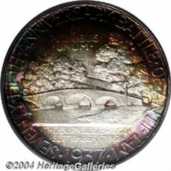<table><tr><td><table><tr><td>1937 50C Antietam MS68 PCGS. Struck to commemorate the 75th anniversary of the Civil War Battle of Antietam, examples of this Half Dollar are a mainstay in our auctions in lower grades. However, at the MS68 level of preservation, this coin is a major numismatic rarity with two MS68 pieces being offered at this Heritage sale! Portraits of Major General George B. McClellan, commander of the Union Army of the Potomac and General Robert E. Lee, commander of the Confederate Army of Northern Virginia, adorn the obverse. The reverse depicts the bitterly contested Burnside Bridge over Antietam Creek, at which Brigadier General Robert Toombs' Brigade repulsed the Union corps of General Ambrose E. Burnside. This is an original toned example with rich deep gold, crimson-magenta, and emerald-green colors over the obverse and around the reverse periphery. Sharply struck with not even a single distraction, the surfaces are awash in warm frosty luster. Among the several awe-inspiring Silver Commemoratives that we are offering in this sale, and a coin that is sure to inspire spirited bidding among specialists.From the Fox Valley Coin Commemoratives. <BR><BR><B>Important notice:</B> Heritage usually auctions material at the rate of 200-250 lots per hour. On some occasions eBay Live bid software or the Internet may not be able to keep up with the pace of the auction. We recommend placing a realistic absentee bid now as insurance to avoid disappointment. Occasionally the auctioneer may eliminate or reject an eBay Live bid, and the auctioneer may also reopen a lot after the close of the eBay live bidding (usually because we missed an audience bid), and may reject your bid even if it shows you as the winning bidder. By bidding via eBay Live, you agree that Heritage may award the lot to another bidder at its sole discretion under the circumstances described above or any other reasonable circumstances. Since eBay bids are not shown to us until we open the lot on the floor, we treat those bids just like floor bids. In most cases the floor responds before the eBay bid is presented to us, due to Internet lag time, so for consistency we have made it a policy that floor bids are always considered first over tie eBay live bids. Also please note that all Heritage lots purchased through eBay Live carry a 20% Buyer's Premium. Please make sure you read the Terms and Conditions before you bid. <BR><BR><B>IMPORTANT ANNOUNCEMENT ABOUT RESERVES:</B> Heritage now divulges all reserves on its web site 7 days before every auction. If you want to know whether the reserve on this lot has been met, and if not, what the reserve amount is, please visit this lot page on the HeritageCoin.com web site, or email: bid@HeritageGalleries.com </span></font></td></tr></table></td></tr></table>