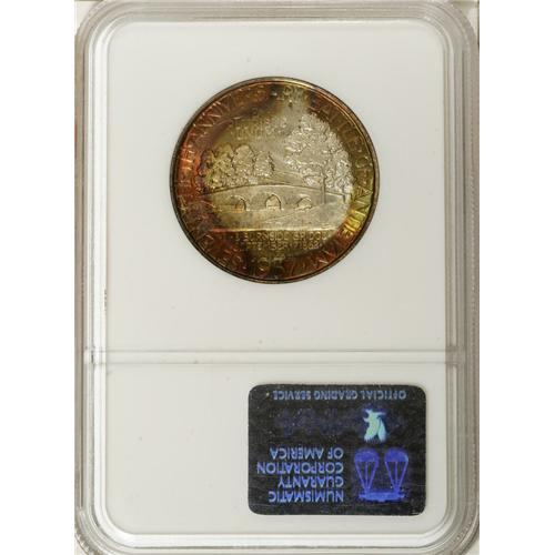 <B>1937 50C Antietam MS69 NGC.</B></I> In its 20-year history, NGC has awarded a grade of MS69 or MS69 <img border='0' src='http://www.heritagecoins.com/images/star.gif' width=10 height=10> to exactly five classic commemorative coins. One is an Isabella quarter, now in a PCGS MS68 holder and no longer available as an NGC-certified coin. The records show one special 1938-D Boone graded MS69 S. A single 1937-D Oregon commemorative has achieved MS69 as well. Surprisingly, the other two pieces belong to the same issue: not the Norfolk, a logical guess, but the Antietam.<BR> Q. David Bowers (1991) wrote that despite the low net mintage of 18,028 pieces, "1937 Antietam half dollars are readily available," clarifying that most were in lesser Mint State grades, though Gems were available. Further, "This issue was handled with care ... . Most examples are very lustrous and frosty." This coin takes those principles to their ultimate conclusion. Russet-amber, olive-green, ruby, and crimson patina covers the entirety of the obverse, while similar colors appear at the outer portion of the reverse. Strongly lustrous overall, though the piece truly shines at the minimally toned center of the reverse. All of this appears on surfaces that are essentially perfect to the unaided eye, with none of the tiny abrasions that appear so often near the bridge. A magnificent condition rarity, one that demands personal inspection. As noted above, NGC has graded just two coins at this lofty level, and PCGS acknowledges none (3/07).<BR><I>From The Cary & Cheryl Porter Collection.</B></I><BR><BR><b>Shipping:</b> Coins & Currency (<a target="_blank" href="http://www.heritageauctions.com/common/shipping.php">view shipping information</a>)