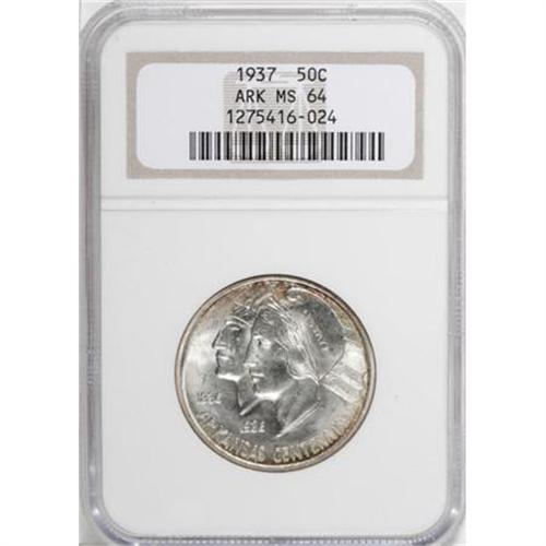 <B>1937 50C Arkansas MS64 NGC.</B></I> NGC Census: (290/231). PCGS Population (403/313). Mintage: 5,505. Numismedia Wsl. Price for NGC/PCGS coin in MS64: $103. (#9241)<BR><I>From The Frank DuVall Collection of U.S. Commemoratives.</B></I><BR><BR><b>Shipping:</b> Coins & Currency (<a target="_blank" href="http://www.heritageauctions.com/common/shipping.php">view shipping information</a>\)