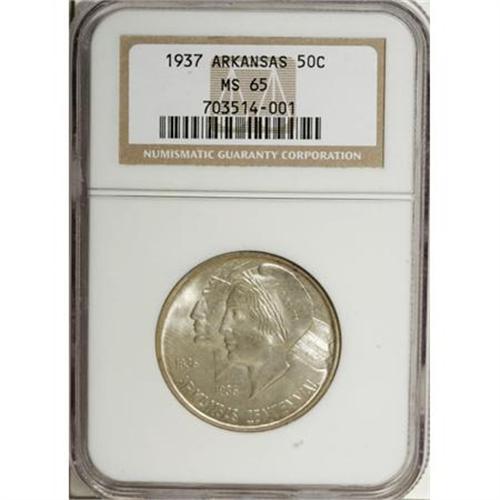 <B>1937 50C Arkansas MS65 NGC.</B></I> NGC Census: (184/47). PCGS Population (226/88). Mintage: 5,505. Numismedia Wsl. Price for NGC/PCGS coin in MS65: $300. (#9241)<BR><BR><b>Shipping:</b> Coins & Currency (<a target="_blank" href="http://www.heritageauctions.com/common/shipping.php">view shipping information</a>)