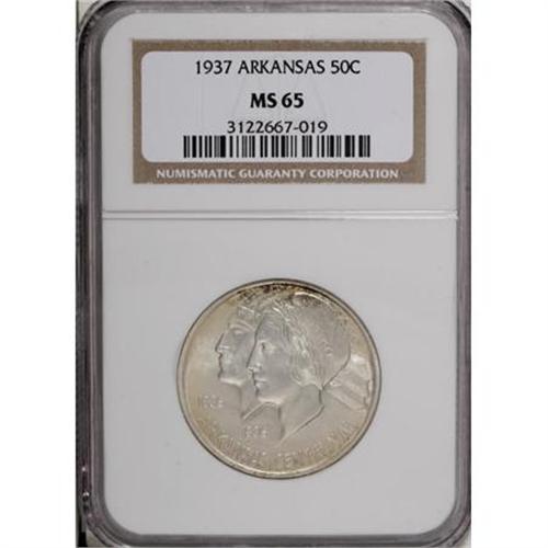 <B>1937 50C Arkansas MS65 NGC.</B></I> . NGC Census: (188/47). PCGS Population (228/89). Mintage: 5,505. Numismedia Wsl. Price for NGC/PCGS coin in MS65: $300. (#9241)<BR><BR><b>Shipping:</b> Coins & Currency (<a target="_blank" href="http://www.heritageauctions.com/common/shipping.php">view shipping information</a>)