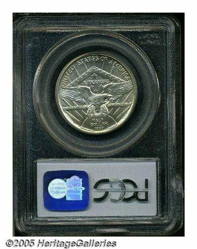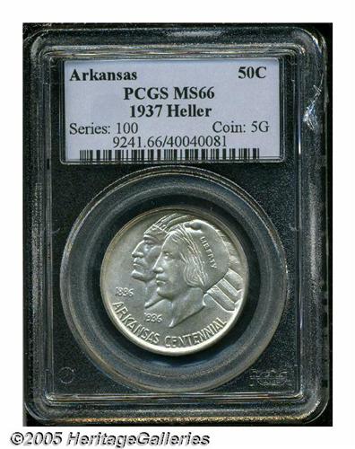 <B>1937<50C> Arkansas MS66 PCGS.</B></I> Ex: Heller. A bright, scintillating Gem, one of a mere 5,005 pieces struck, with just a hint of golden color at the base of the reverse.<BR><I>From The Western Hills Collection.</B></I>