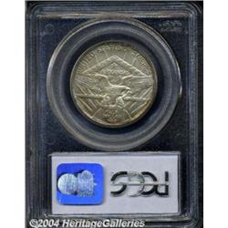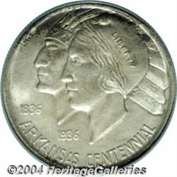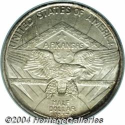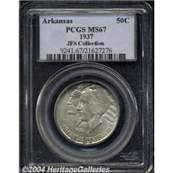 <B>1937<50C> Arkansas MS67 PCGS.</B></I> The well struck, satiny surfaces have light argent-gray patina over each side, with a thin band of charcoal and gold color near some of the borders. This Arkansas commem seems worthy of the Superb Gem grade level, by virtue of its creamy, nearly mark-free surfaces, and exceptional eye appeal. Population: 4 in 67, 0 finer (6/04).<BR><I>Ex: Long Beach Signature Sale (Heritage, 9/02), lot 9198, which realized $10,925.</B></I><BR><I>From the JFS Collection, the #1 All-Time PCGS Registry Set.</B></I> <BR><BR><B>Important notice:</B> Heritage usually auctions material at the rate of 200-250 lots per hour. On some occasions eBay Live bid software or the Internet may not be able to keep up with the pace of the auction. We recommend placing a realistic absentee bid now as insurance to avoid disappointment. Occasionally the auctioneer may eliminate or reject an eBay Live bid, and the auctioneer may also reopen a lot after the close of the eBay live bidding (usually because we missed an audience bid), and may reject your bid even if it shows you as the winning bidder. By bidding via eBay Live, you agree that Heritage may award the lot to another bidder at its sole discretion under the circumstances described above or any other reasonable circumstances. Since eBay bids are not shown to us until we open the lot on the floor, we treat those bids just like floor bids. In most cases the floor responds before the eBay bid is presented to us, due to Internet lag time, so for consistency we have made it a policy that floor bids are always considered first over tie eBay live bids. Also please note that all Heritage lots purchased through eBay Live carry a 20% Buyer's Premium. Please make sure you read the Terms and Conditions before you bid. </span></font></tr></table></td></tr></table>