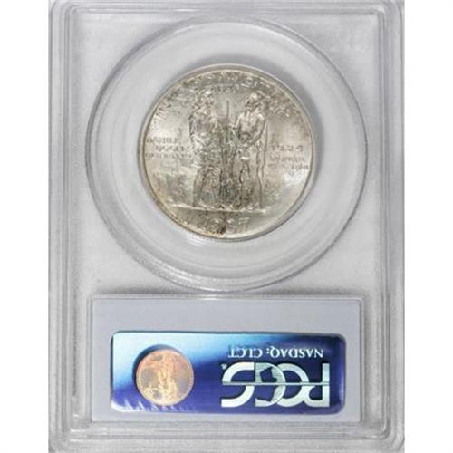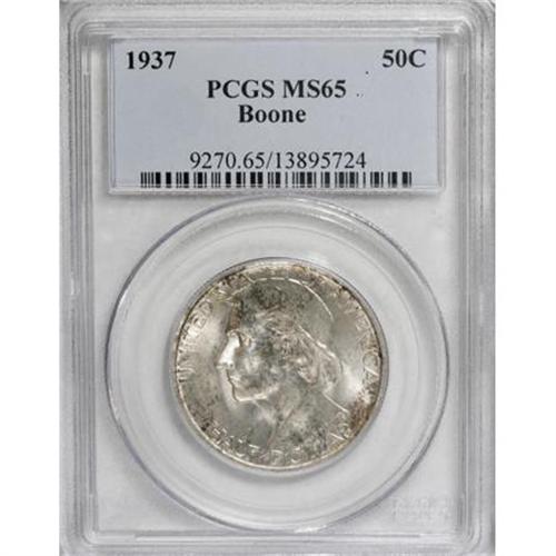 <B>1937 50C Boone MS65 PCGS.</B></I> PCGS Population (666/399). NGC Census: (494/259). Mintage: 9,810. Numismedia Wsl. Price for NGC/PCGS coin in MS65: $220. (#9270)<BR><I>From The Frank DuVall Collection of U.S. Commemoratives.</B></I><BR><BR><b>Shipping:</b> Coins & Currency (<a target="_blank" href="http://www.heritageauctions.com/common/shipping.php">view shipping information</a>\)