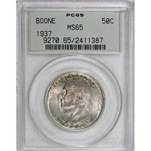 <B>1937 50C Boone MS65 PCGS.</B></I> PCGS Population (678/416). NGC Census: (498/263). Mintage: 9,810. Numismedia Wsl. Price for NGC/PCGS coin in MS65: $220. (#9270)<BR><BR><b>Shipping:</b> Coins & Currency (<a target="_blank" href="http://www.heritageauctions.com/common/shipping.php">view shipping information</a>)