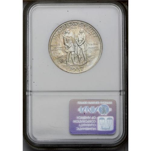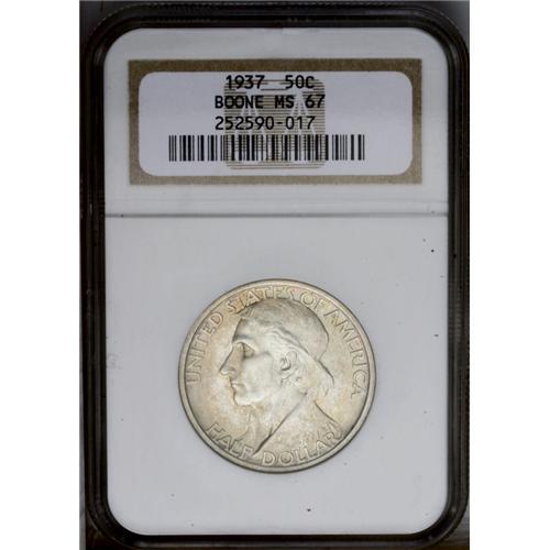 <B>1937<50C> Boone MS67 NGC.</B></I> Battleship-gray, lime, and champagne-gold tones overlie this satiny and attentively struck Superb Gem. Beautifully undisturbed, and worthy of a competitive bid. Census: 35 in 67, 0 finer (3/06). <BR><BR><B>Important notice:</B> Heritage usually auctions material at the rate of 200-250 lots per hour. On some occasions eBay Live bid software or the Internet may not be able to keep up with the pace of the auction. We recommend placing a realistic absentee bid now as insurance to avoid disappointment. Occasionally the auctioneer may eliminate or reject an eBay Live bid, and the auctioneer may also reopen a lot after the close of the eBay live bidding (usually because we missed an audience bid), and may reject your bid even if it shows you as the winning bidder. By bidding via eBay Live, you agree that Heritage may award the lot to another bidder at its sole discretion under the circumstances described above or any other reasonable circumstances. Since eBay bids are not shown to us until we open the lot on the floor, we treat those bids just like floor bids. In most cases the floor responds before the eBay bid is presented to us, due to Internet lag time, so for consistency we have made it a policy that floor bids are always considered first over tie eBay live bids. Also please note that all Heritage lots purchased through eBay Live carry a 20% Buyer's Premium. Please make sure you read the Terms and Conditions before you bid. This lot is being auctioned in conjunction with a live floor auction by Heritage Galleries & Auctioneers. All final auction and invoice information will be supplied by Heritage Galleries & Auctioneers, and all other information should be considered preliminary. Lot:4887 <BR><BR><B>Winning Notification and Billing:</B> After the FINAL session in this auction is complete, Heritage will send e-mail and snail mail invoices. This process normally takes several days. All final auction and invoice information will be supplied by Heritage Galleries & Auctioneers, and all other information should be considered preliminary. <BR><BR>This auction will be conducted on a live auction floor and over the Internet through eBay Live. If you choose to place an absentee bid, please take a moment to <font color='#0000ff'><u><a href='http://pages.ebay.com/liveauctions/help/before/laabsentee.html'>learn how eBay Live absentee bidding works</a></u></font><font color='#000000'>