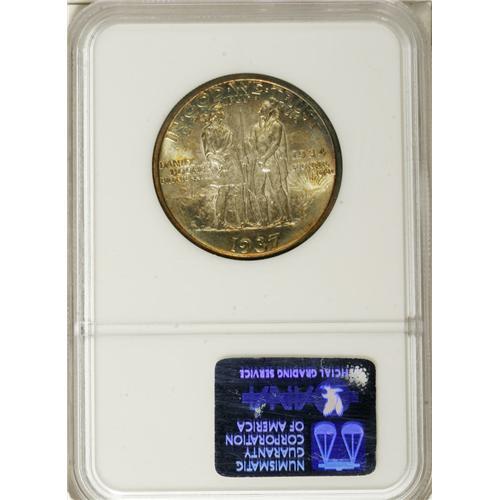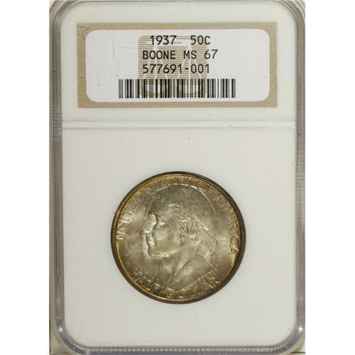 <B>1937 50C Boone MS67 NGC.</B></I> Lovely gold and powder-blue peripheral patina enhances the visual appeal of this carefully preserved commemorative. This is the last Boone issue for which Philadelphia produced more coins than the branch mints, as 1939 would see uniform production of 2,100 pieces each. Census: 39 in 67, 2 in 67 S, 0 finer (4/07).<BR><I>From The Cary & Cheryl Porter Collection.</B></I><BR><BR><b>Shipping:</b> Coins & Currency (<a target="_blank" href="http://www.heritageauctions.com/common/shipping.php">view shipping information</a>)