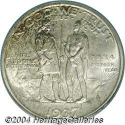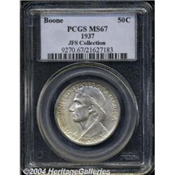 <B>1937<50C> Boone MS67 PCGS.</B></I> Boone Bicentennial Commission Chairman C. Frank Dunn announced that the 1937 issue would end the lengthy series of Boone half dollars. Of course, such was not the case and a further issue followed the next year. This is a lovely Superb Gem-quality example with satiny silver luster beneath pale lilac and iridescent toning. Population: 49 in 67, 3 finer (6/04).<BR><I>Ex: Exclusive Internet Auction #21071, (Heritage, 7/01), lot 2015, which realized $1,450.</B></I><BR><I>From the JFS Collection, the #1 All-Time PCGS Registry Set.</B></I> <BR><BR><B>Important notice:</B> Heritage usually auctions material at the rate of 200-250 lots per hour. On some occasions eBay Live bid software or the Internet may not be able to keep up with the pace of the auction. We recommend placing a realistic absentee bid now as insurance to avoid disappointment. Occasionally the auctioneer may eliminate or reject an eBay Live bid, and the auctioneer may also reopen a lot after the close of the eBay live bidding (usually because we missed an audience bid), and may reject your bid even if it shows you as the winning bidder. By bidding via eBay Live, you agree that Heritage may award the lot to another bidder at its sole discretion under the circumstances described above or any other reasonable circumstances. Since eBay bids are not shown to us until we open the lot on the floor, we treat those bids just like floor bids. In most cases the floor responds before the eBay bid is presented to us, due to Internet lag time, so for consistency we have made it a policy that floor bids are always considered first over tie eBay live bids. Also please note that all Heritage lots purchased through eBay Live carry a 20% Buyer's Premium. Please make sure you read the Terms and Conditions before you bid. </span></font></tr></table></td></tr></table>