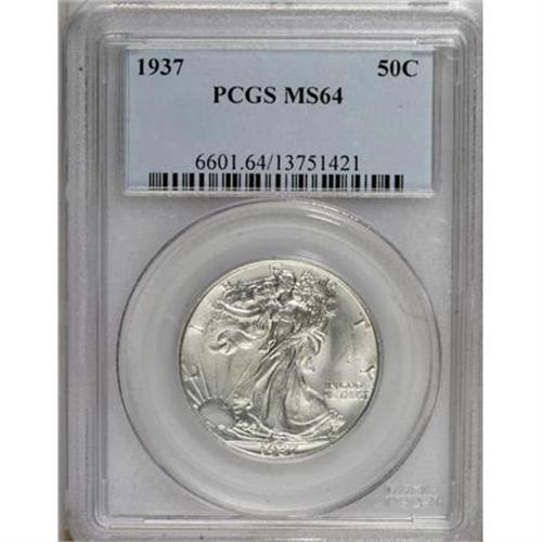 <B>1937 50C MS64 PCGS.</B></I> PCGS Population (1277/1836). NGC Census: (743/1324). Mintage: 9,527,728. Numismedia Wsl. Price for NGC/PCGS coin in MS64: $86. (#6601)<BR><BR><B>Coin Engraver:</B> Adolph A. Weinman<BR><BR><b>Shipping:</b> Coins & Currency (<a target="_blank" href="http://www.heritageauctions.com/common/shipping.php">view shipping information</a>)