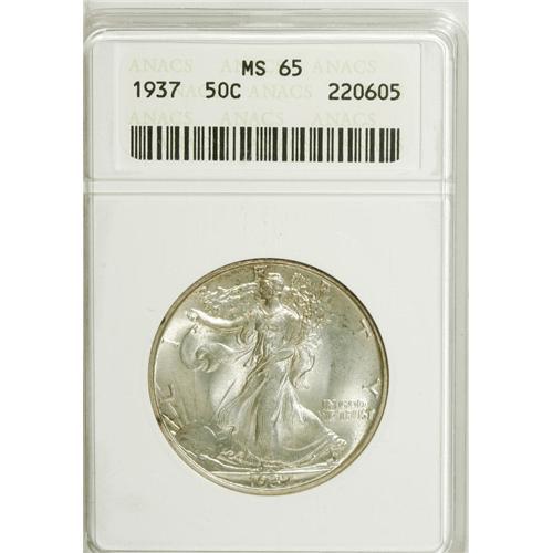 <B>1937 50C MS65 ANACS.</B></I> NGC Census: (935/377). PCGS Population (1175/618). Mintage: 9,527,728. Numismedia Wsl. Price: $324. (#6601)<BR><BR><b>Shipping:</b> Coins & Currency (<a target="_blank" href="http://www.heritageauctions.com/common/shipping.php">view shipping information</a>)