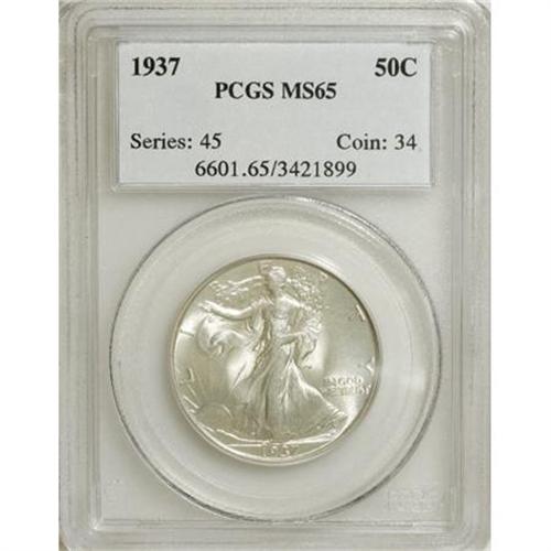 <B>1937 50C MS65 PCGS.</B></I> PCGS Population (1178/621). NGC Census: (935/380). Mintage: 9,527,728. Numismedia Wsl. Price for NGC/PCGS coin in MS65: $300. (#6601)<BR><BR><b>Shipping:</b> Coins & Currency (<a target="_blank" href="http://www.heritageauctions.com/common/shipping.php">view shipping information</a>)
