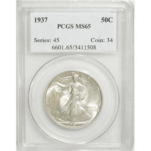 <B>1937 50C MS65 PCGS.</B></I> PCGS Population (1214/634). NGC Census: (948/389). Mintage: 9,527,728. Numismedia Wsl. Price for NGC/PCGS coin in MS65: $255. (#6601)<BR><BR><B>Coin Engraver:</B> Adolph A. Weinman<BR><BR><b>Shipping:</b> Coins & Currency (<a target="_blank" href="http://www.heritageauctions.com/common/shipping.php">view shipping information</a>)