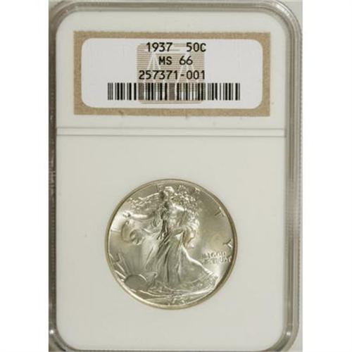 <B>1937 50C MS66 NGC.</B></I> NGC Census: (318/66). PCGS Population (537/96). Mintage: 9,527,728. Numismedia Wsl. Price for NGC/PCGS coin in MS66: $510. (#6601)<BR><BR><B>Coin Engraver:</B> Adolph A. Weinman<BR><BR><b>Shipping:</b> Coins & Currency (<a target="_blank" href="http://www.heritageauctions.com/common/shipping.php">view shipping information</a>)