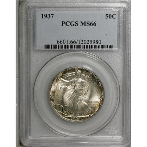 <B>1937 50C MS66 PCGS.</B></I> PCGS Population (538/95). NGC Census: (322/67). Mintage: 9,527,728. Numismedia Wsl. Price for NGC/PCGS coin in MS66: $510. (#6601)<BR><BR><B>Coin Engraver:</B> Adolph A. Weinman<BR><BR><b>Shipping:</b> Coins & Currency (<a target="_blank" href="http://www.heritageauctions.com/common/shipping.php">view shipping information</a>)