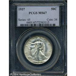 1937 50C MS67 PCGS. Bright cartwheel luster emanat <B>1937 50C MS67 PCGS.</B></I> Bright cartwheel luster emanates from underneath light opaque toning on the obverse of this impressive Superb Gem. As expected, this coin is well struck, clean, and very appealing to the eye. Population: 82 in 67, 2 finer (10/04). <BR><BR><B>Important notice:</B> Heritage usually auctions material at the rate of 200-250 lots per hour. On some occasions eBay Live bid software or the Internet may not be able to keep up with the pace of the auction. We recommend placing a realistic absentee bid now as insurance to avoid disappointment. Occasionally the auctioneer may eliminate or reject an eBay Live bid, and the auctioneer may also reopen a lot after the close of the eBay live bidding (usually because we missed an audience bid), and may reject your bid even if it shows you as the winning bidder. By bidding via eBay Live, you agree that Heritage may award the lot to another bidder at its sole discretion under the circumstances described above or any other reasonable circumstances. Since eBay bids are not shown to us until we open the lot on the floor, we treat those bids just like floor bids. In most cases the floor responds before the eBay bid is presented to us, due to Internet lag time, so for consistency we have made it a policy that floor bids are always considered first over tie eBay live bids. Also please note that all Heritage lots purchased through eBay Live carry a 20% Buyer's Premium. Please make sure you read the Terms and Conditions before you bid. This lot is being auctioned in conjunction with a live floor auction by Heritage Galleries & Auctioneers. All final auction and invoice information will be supplied by Heritage Galleries & Auctioneers, and all other information should be considered preliminary. Lot:6187