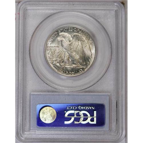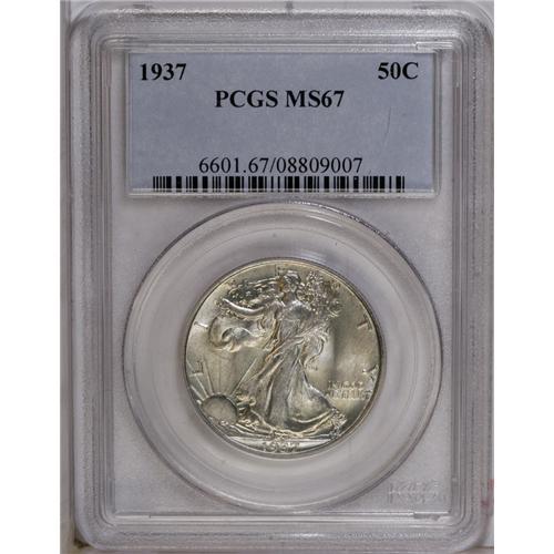 <B>1937<50C> MS67 PCGS.</B></I> This Superb Gem example has satiny silver luster with faint golden toning. Reflective fields, especially on the obverse, are the result of heavy die polish. Sharply struck. Only two finer examples have been certified by PCGS.<BR><I>From The Big Tex Registry Set of Walking Liberty Halves.</B></I>