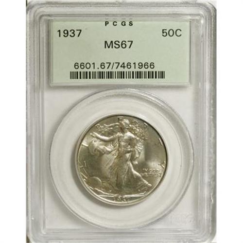 <B>1937 50C MS67 PCGS.</B></I> This Superb Gem Walker shows well defined design elements and lovely, creamy luster over each side. A couple of wispy marks, located between L and I on the left side of the obverse, are noted for the sake of accuracy. Housed in a green label PCGS holder. Population: 94 in 67, 2 finer (7/07). <BR><BR><B>Coin Engraver:</B> Adolph A. Weinman<BR><BR><b>Shipping:</b> Coins & Currency (<a target="_blank" href="http://www.heritageauctions.com/common/shipping.php">view shipping information</a>)