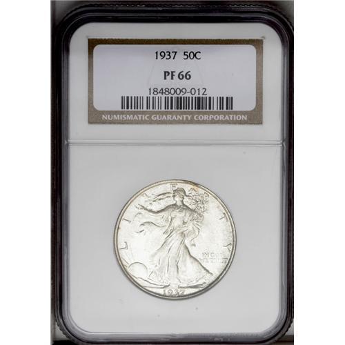 <B>1937<50C> PR66 NGC.</B></I> Fully struck with glassy reflectivity in the fields and a light coating of opaque, creamy toning over both sides. A bit of speckled patina is noted over obverse and reverse, along with slight rainbow iridescence along the left reverse border. A well preserved Premium Gem proof.