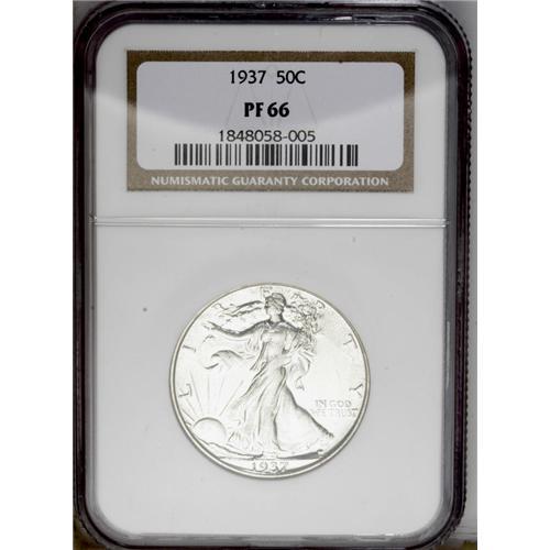 <B>1937<50C> PR66 NGC.</B></I> This pretty Premium Gem offers outstanding luster and essentially pristine surfaces with some milky-white patina, although the strike is somewhat mushy on Liberty's branch hand. There is little field/device contrast on this piece, one of a scant 5,728 proofs minted.<BR><I>From The Lewis (Tahoe) Collection.</B></I>