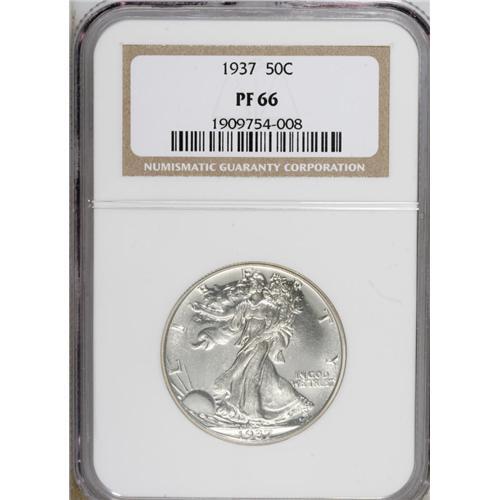 <B>1937 50C PR66 NGC.</B></I> When the United States resumed proof coinage after a two-decade hiatus, the half dollar was the largest available denomination. This exactingly struck and strongly reflective Premium Gem is from one of only seven proof Walking Liberty issues produced and is untoned save for a hint of gold on the obverse.<BR><BR><b>Shipping:</b> Coins & Currency (<a target="_blank" href="http://www.heritageauctions.com/common/shipping.php">view shipping information</a>)