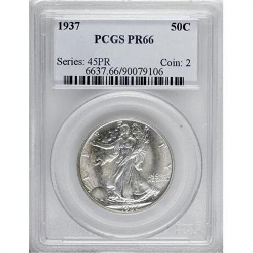 <B>1937 50C PR66 PCGS.</B></I> A barely discernible veil of powder-blue and beige patina rests on impeccably preserved, bright surfaces. The motifs are crisply struck throughout on this second-year proof Walking Liberty half.<BR><BR><b>Shipping:</b> Coins & Currency (<a target="_blank" href="http://www.heritageauctions.com/common/shipping.php">view shipping information</a>)