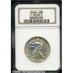<B>1937<50C> PR67 NGC.</B></I> Wonderfully preserved under a layer of milky golden-gray patina, and scattered apricot-tan mottling near the borders. Sharply struck and mark-free, a marvelous Superb Gem.<BR><I>From The Dr. Frank Lanza Collection of Walking Liberty Half Dollars.</B></I> <BR><BR><B>Important notice:</B> Heritage usually auctions material at the rate of 200-250 lots per hour. On some occasions eBay Live bid software or the Internet may not be able to keep up with the pace of the auction. We recommend placing a realistic absentee bid now as insurance to avoid disappointment. Occasionally the auctioneer may eliminate or reject an eBay Live bid, and the auctioneer may also reopen a lot after the close of the eBay live bidding (usually because we missed an audience bid), and may reject your bid even if it shows you as the winning bidder. By bidding via eBay Live, you agree that Heritage may award the lot to another bidder at its sole discretion under the circumstances described above or any other reasonable circumstances. Since eBay bids are not shown to us until we open the lot on the floor, we treat those bids just like floor bids. In most cases the floor responds before the eBay bid is presented to us, due to Internet lag time, so for consistency we have made it a policy that floor bids are always considered first over tie eBay live bids. Also please note that all Heritage lots purchased through eBay Live carry a 20% Buyer's Premium. Please make sure you read the Terms and Conditions before you bid. </span></font></tr></table></td></tr></table>