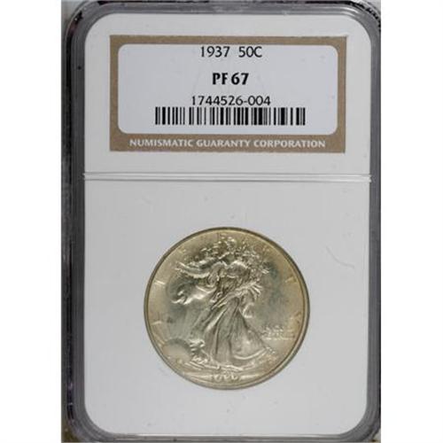 <B>1937 50C PR67 NGC.</B></I> An enticing Superb Gem specimen from the second of just seven proof Walker issues. This boldly impressed piece gleams beneath hazy khaki-olive patina that deepens near the margins. NGC has graded 17 finer examples.<BR><BR><B>Coin Engraver:</B> Adolph A. Weinman<BR><BR><b>Shipping:</b> Coins & Currency (<a target="_blank" href="http://www.heritageauctions.com/common/shipping.php">view shipping information</a>)