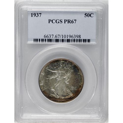 <B>1937 50C PR67 PCGS.</B></I> The proofs of 1937 represent a noteworthy increase in quality from the previous year, largely due to the greater experience of Mint personnel. This well-preserved Superb Gem has hazy patina over moderately reflective surfaces, as well as russet-bronze and magenta toning at the upper and lower obverse periphery. PCGS has awarded a higher grade to just nine specimens (1/07).<BR><BR><b>Shipping:</b> Coins & Currency (<a target="_blank" href="http://www.heritageauctions.com/common/shipping.php">view shipping information</a>)