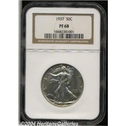 <B>1937<50C> PR68 NGC.</B></I> Both the obverse and the reverse exhibit a needle sharp strike--as one should expect for a proof Walking Liberty Half Dollar. Lightly toned with for a few blushes of pale golden-blue iridescence on the obverse and some milky color on the reverse, the surfaces present a reflective, virtually pristine sheen from rim to rim. An unusually high grade survivor of the issue, and unsurpassable at either service (6/04). <BR><BR><B>Important notice:</B> Heritage usually auctions material at the rate of 200-250 lots per hour. On some occasions eBay Live bid software or the Internet may not be able to keep up with the pace of the auction. We recommend placing a realistic absentee bid now as insurance to avoid disappointment. Occasionally the auctioneer may eliminate or reject an eBay Live bid, and the auctioneer may also reopen a lot after the close of the eBay live bidding (usually because we missed an audience bid), and may reject your bid even if it shows you as the winning bidder. By bidding via eBay Live, you agree that Heritage may award the lot to another bidder at its sole discretion under the circumstances described above or any other reasonable circumstances. Since eBay bids are not shown to us until we open the lot on the floor, we treat those bids just like floor bids. In most cases the floor responds before the eBay bid is presented to us, due to Internet lag time, so for consistency we have made it a policy that floor bids are always considered first over tie eBay live bids. Also please note that all Heritage lots purchased through eBay Live carry a 20% Buyer's Premium. Please make sure you read the Terms and Conditions before you bid. </span></font></tr></table></td></tr></table>
