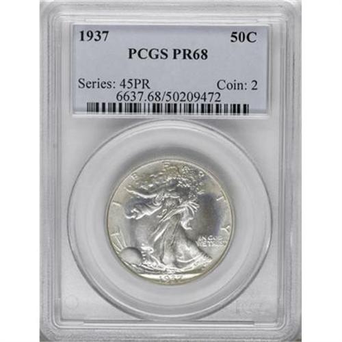 <B>1937 50C PR68 PCGS. CAC.</B></I> Khaki-gold and ruby-red tints adorn the margins, while the centers offer only a whisper of ice-blue and olive patina. A pinpoint-sharp specimen with satin luster and immaculate preservation. Among the seven proof Walking Liberty dates, only the 1936 has a lower mintage. Population: 9 in 68, 0 finer (11/07).<BR><I>From The Kallenberg #1 PCGS Registry Set Of Proof Half Dollars.</B></I><BR><BR><B>Coin Engraver:</B> Adolph A. Weinman<BR><BR><b>Shipping:</b> Coins & Currency (<a target="_blank" href="http://www.heritageauctions.com/common/shipping.php">view shipping information</a>)