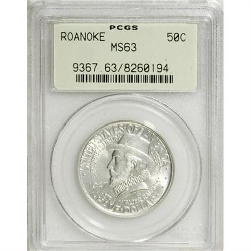 <B>1937 50C Roanoke MS63 PCGS.</B></I> . PCGS Population (366/4790). NGC Census: (76/3064). Mintage: 29,030. Numismedia Wsl. Price for NGC/PCGS coin in MS63: $246. (#9367)<BR><BR><b>Shipping:</b> Coins & Currency (<a target="_blank" href="http://www.heritageauctions.com/common/shipping.php">view shipping information</a>)