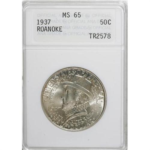 <B>1937 50C Roanoke MS65 ANACS.</B></I> NGC Census: (1334/1078). PCGS Population (1961/1265). Mintage: 29,030. Numismedia Wsl. Price for NGC/PCGS coin in MS65: $280. (#9367)<BR><BR><b>Shipping:</b> Coins & Currency (<a target="_blank" href="http://www.heritageauctions.com/common/shipping.php">view shipping information</a>)