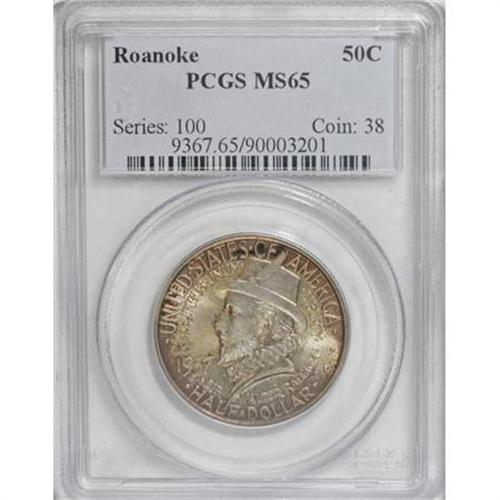 <B>1937 50C Roanoke MS65 PCGS.</B></I> PCGS Population (1930/1236). NGC Census: (1310/1050). Mintage: 29,030. Numismedia Wsl. Price for NGC/PCGS coin in MS65: $300. (#9367)<BR><BR><b>Shipping:</b> Coins & Currency (<a target="_blank" href="http://www.heritageauctions.com/common/shipping.php">view shipping information</a>\)
