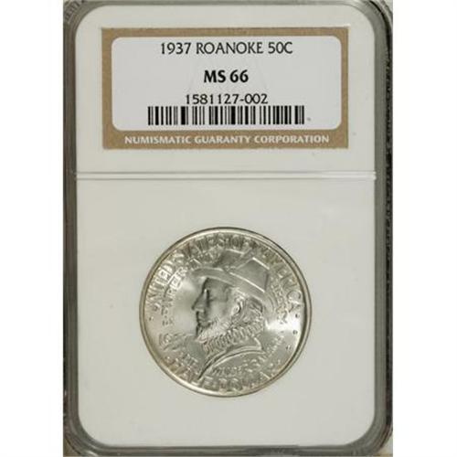<B>1937 50C Roanoke MS66 NGC.</B></I> NGC Census: (846/217). PCGS Population (1015/239). Mintage: 29,030. Numismedia Wsl. Price for NGC/PCGS coin in MS66: $330. (#9367)<BR><BR><b>Shipping:</b> Coins & Currency (<a target="_blank" href="http://www.heritageauctions.com/common/shipping.php">view shipping information</a>)