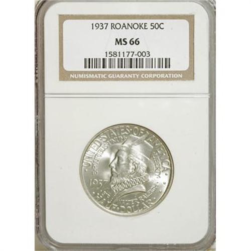 <B>1937 50C Roanoke MS66 NGC.</B></I> NGC Census: (855/218). PCGS Population (1018/239). Mintage: 29,030. Numismedia Wsl. Price for NGC/PCGS coin in MS66: $330. (#9367)<BR><BR><b>Shipping:</b> Coins & Currency (<a target="_blank" href="http://www.heritageauctions.com/common/shipping.php">view shipping information</a>)