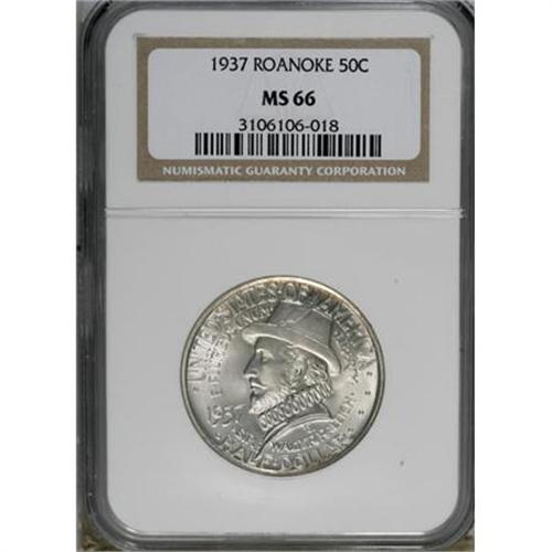 <B>1937 50C Roanoke MS66 NGC.</B></I> . NGC Census: (861/218). PCGS Population (1023/241). Mintage: 29,030. Numismedia Wsl. Price for NGC/PCGS coin in MS66: $320. (#9367)<BR><BR><b>Shipping:</b> Coins & Currency (<a target="_blank" href="http://www.heritageauctions.com/common/shipping.php">view shipping information</a>)