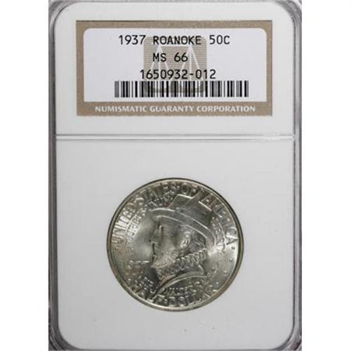 <B>1937 50C Roanoke MS66 NGC.</B></I> NGC Census: (859/219). PCGS Population (1024/241). Mintage: 29,030. Numismedia Wsl. Price for NGC/PCGS coin in MS66: $320. (#9367)<BR><BR><b>Shipping:</b> Coins & Currency (<a target="_blank" href="http://www.heritageauctions.com/common/shipping.php">view shipping information</a>)