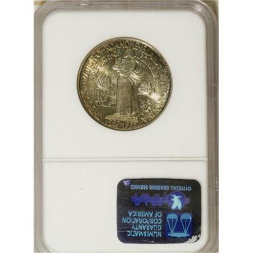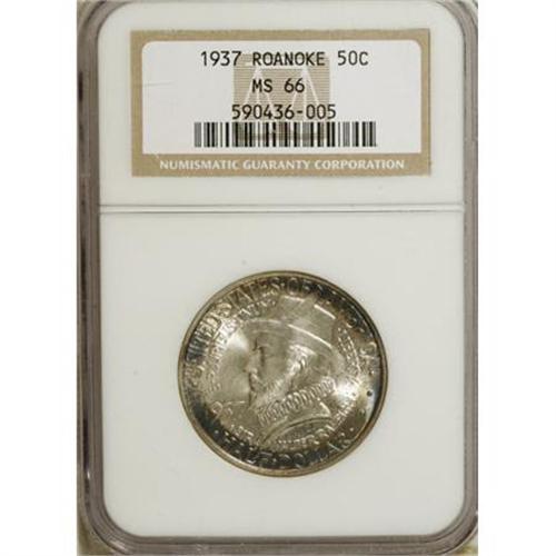 <B>1937 50C Roanoke MS66 NGC.</B></I> NGC Census: (859/219). PCGS Population (1024/241). Mintage: 29,030. Numismedia Wsl. Price for NGC/PCGS coin in MS66: $320. (#9367)<BR><BR><b>Shipping:</b> Coins & Currency (<a target="_blank" href="http://www.heritageauctions.com/common/shipping.php">view shipping information</a>)