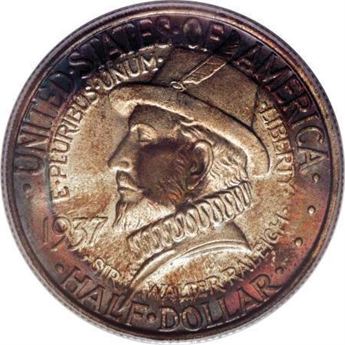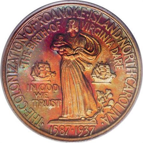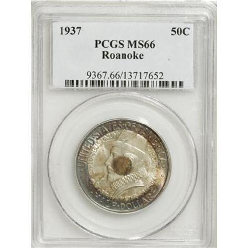 <B>1937 50C Roanoke MS66 PCGS.</B></I> While not a scarce coin, even in MS66, the Roanoke is certainly seldom-seen with the tonal qualities on this piece. Traditional "tab" toning is seen on the obverse with a dark spot in the center from the cardboard tab of the holder. That side is surrounded by deep toning at the margin, caused by the outer tab. The reverse is spectacular with scarlet, golden, and lime-green toning across that side. <BR><BR><b>Shipping:</b> Coins & Currency (<a target="_blank" href="http://www.heritageauctions.com/common/shipping.php">view shipping information</a>)