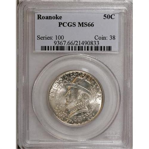 <B>1937 50C Roanoke MS66 PCGS.</B></I> PCGS Population (1023/241). NGC Census: (861/218). Mintage: 29,030. Numismedia Wsl. Price for NGC/PCGS coin in MS66: $320. (#9367)<BR><BR><b>Shipping:</b> Coins & Currency (<a target="_blank" href="http://www.heritageauctions.com/common/shipping.php">view shipping information</a>)
