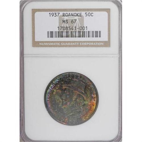 <B>1937 50C Roanoke MS67 NGC.</B></I> Intense violet, sea-green, lemon, and orange toning consume this lustrous and precisely struck Superb Gem. The dramatic patterns of color on this Roanoke half are unlikely to be equaled, and are undoubtedly caused by long-term undisturbed storage within a sulphur-lined envelope.<BR><I>From The Cary & Cheryl Porter Collection, Part Three.</B></I><BR><BR><b>Shipping:</b> Coins & Currency (<a target="_blank" href="http://www.heritageauctions.com/common/shipping.php">view shipping information</a>\)