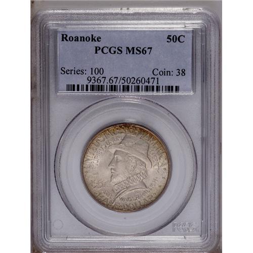 <B>1937 50C Roanoke MS67 PCGS.</B></I> Essentially pristine with varying hues of golden color throughout. As one would expect, locating an example at the next level would be quite difficult and rather pricey. PCGS has certified just 12 such pieces.