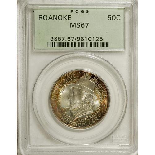<B>1937 50C Roanoke MS67 PCGS.</B></I> Though the original Roanoke mintage consisted on 50,030 pieces including assay coins, 21,000 examples were melted as unsold. On this Superb Gem representative, bronze and magenta peripheral toning surrounds the silver-gray center of the obverse, while the reverse has a blend of the three colors. PCGS has assigned a higher grade to only 12 halves (4/07).<BR><I>From The Cary & Cheryl Porter Collection.</B></I><BR><BR><b>Shipping:</b> Coins & Currency (<a target="_blank" href="http://www.heritageauctions.com/common/shipping.php">view shipping information</a>)