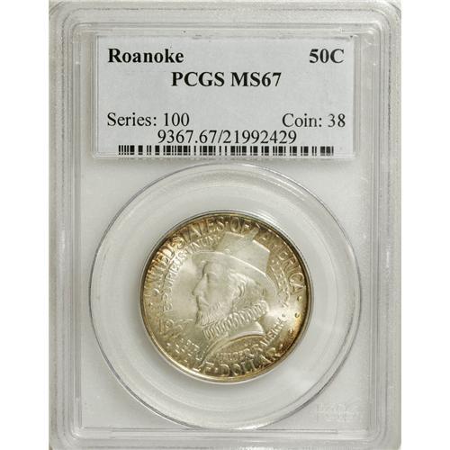 <B>1937 50C Roanoke MS67 PCGS.</B></I> Fully struck, vibrantly lustrous, and nearly pristine, with beautiful iridescent peripheral coloration on both sides. A great Superb Gem example of this popular commemorative issue, which features a portrait of Sir Walter Raleigh on the obverse.<BR><BR><b>Shipping:</b> Coins & Currency (<a target="_blank" href="http://www.heritageauctions.com/common/shipping.php">view shipping information</a>)