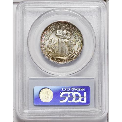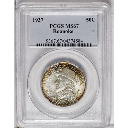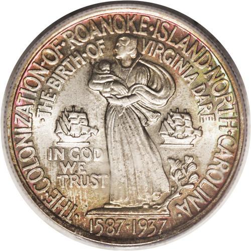 <B>1937<50C> Roanoke MS67 PCGS.</B></I> Superb eye appeal is the hallmark, with delectable jade-green, magenta, and amber hues gracing the rims on each side. The centers are brilliant silver-white, with radiant luster and a bold strike that fully articulates Virginia Dare--the first child born to English parents on the North American continent--and her mother, Eleanor. PCGS has graded 12 examples finer (8/06).