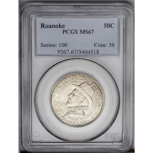 <B>1937<50C> Roanoke MS67 PCGS.</B></I> This is an impressive piece when encountered at this lofty level. This satiny example is nearly flawless with a light overlay of golden color on each side.