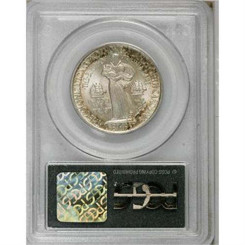 <B>1937 50C Roanoke MS67 PCGS.</B></I> Rings of intermittent gold and orange patina appear at the margins of this otherwise silver-gray Roanoke Superb Gem. Strongly lustrous with excellent detail for this often-weak issue. PCGS has graded 12 finer pieces (10/07).<BR><BR><b>Shipping:</b> Coins & Currency (<a target="_blank" href="http://www.heritageauctions.com/common/shipping.php">view shipping information</a>)